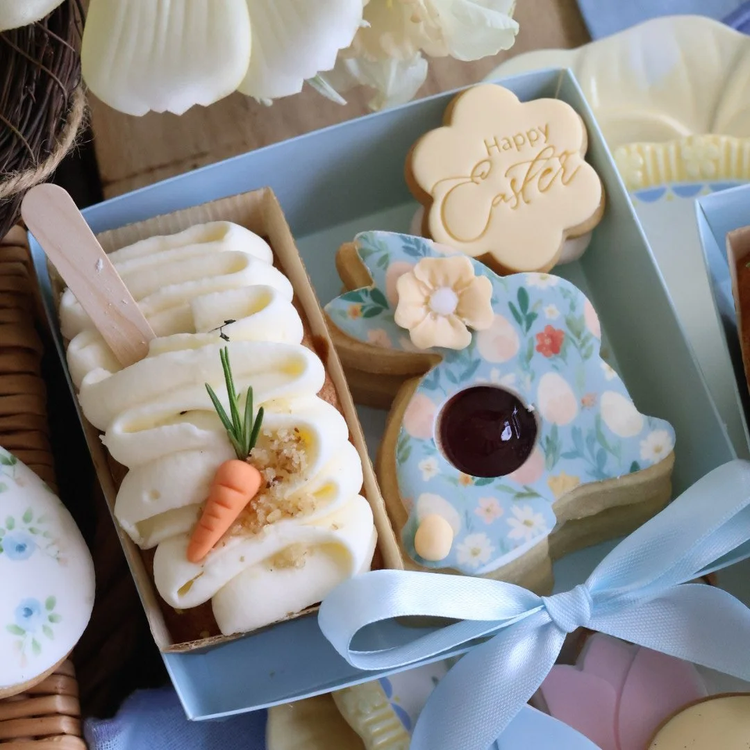 1 x All butter shortbread filled bunny shaped with white chocolate ganache and jam. Fondant iced with our limited edition designs.