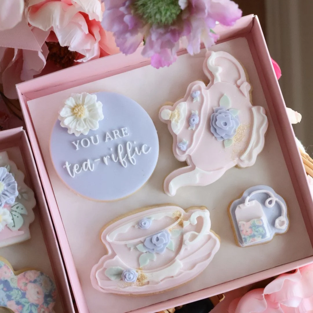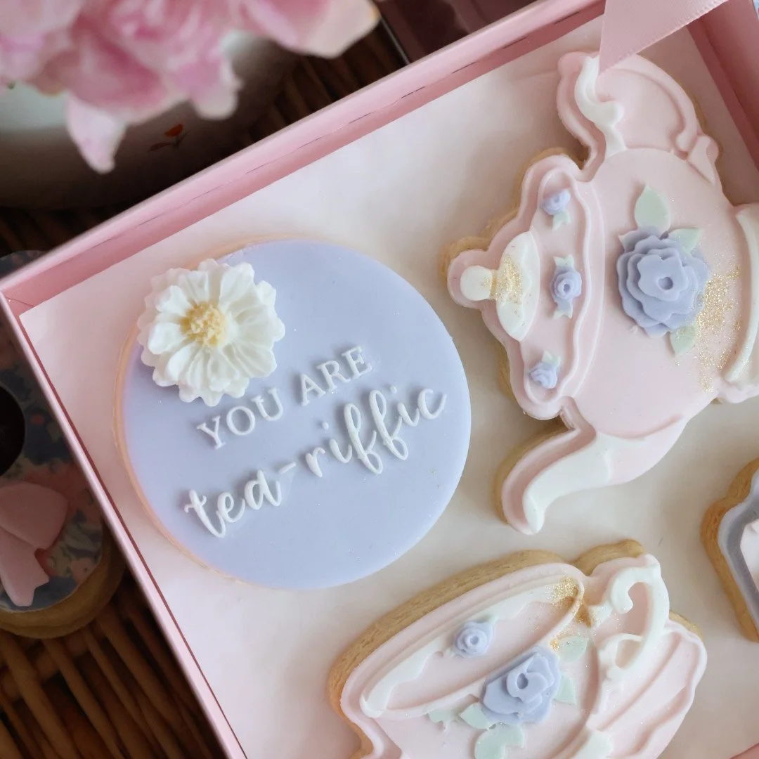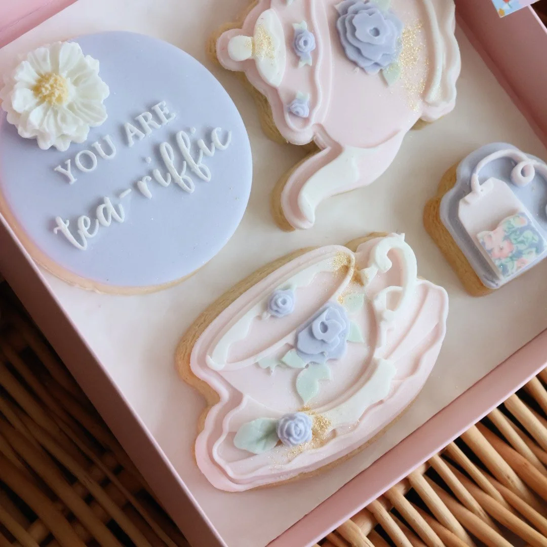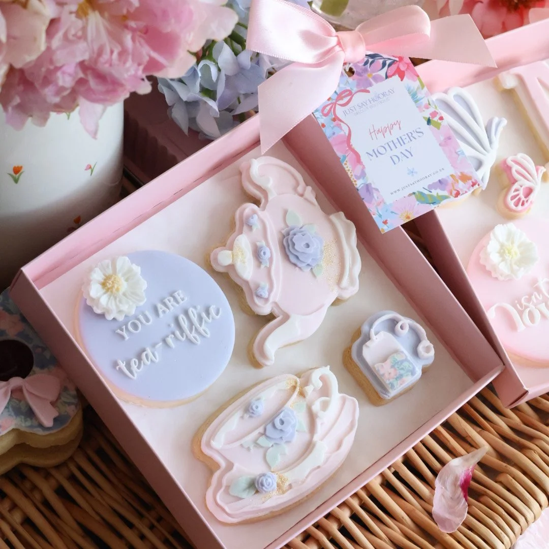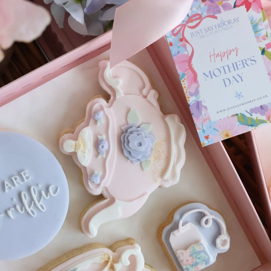 Medium biscuit box. Handmade and decorated fondant covered sugar cookies presented in our luxury clear lid gift box, ribbon, small Mother’s Day gift tag.