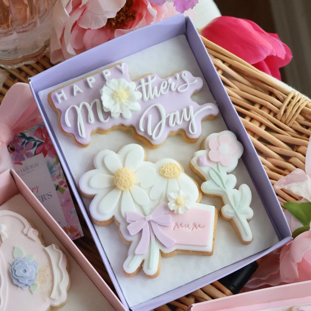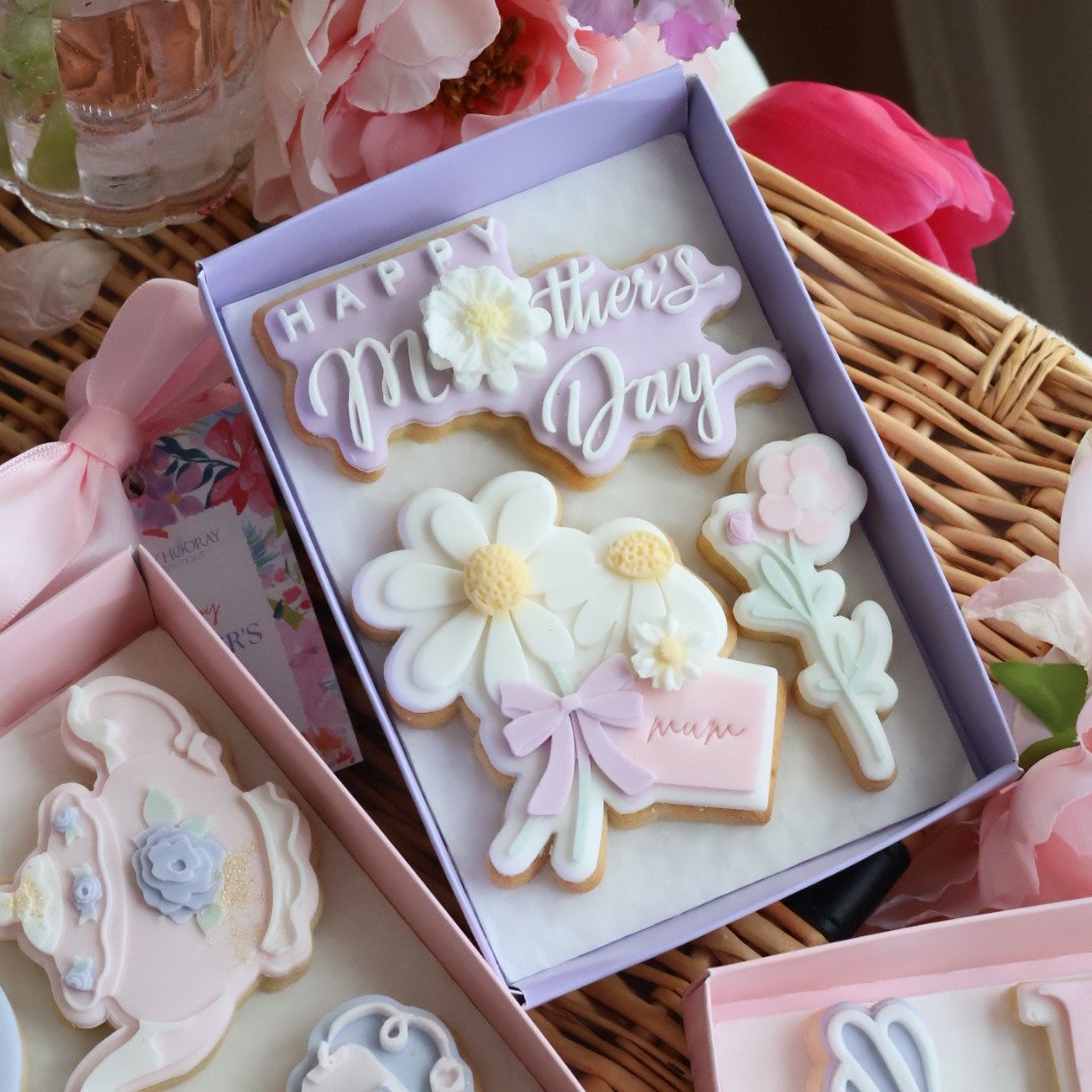 Handmade and decorated fondant covered sugar cookies presented in our luxury clear lid gift box, ribbon, small Mother’s Day gift tag.